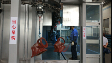 一,油漆車間 經過3個月的努力,油漆車間終于完成了年初規劃的改造工作。工程包括:半自動噴漆線(含4.5m³空壓機機組),φ1米×0.7米噴砂機,2.6米×1.1米浸漆池,另配套安裝了0.5噸自立式起重機,1噸懸臂起重機,2.8噸單梁起重機,總投入約200萬元。 其中噴漆線設備整齊、美觀、實用,噴漆時通過清理除塵去毛刺→噴漆→流平→再噴漆→再流平→烤爐烘烤→強制冷卻等多道工序,徹底解決以前油漆質量不穩定的問題。 噴砂機徹底解決了以前鑄件表面鐵銹和鑄造砂無法去除干凈的問題。噴砂好的零件直接浸漆處理,不僅效率高,防銹漆比原手工涂漆薄,均勻,美觀。 以上多套設備投入使用后明顯提高了生產效率和改善了油漆車間工人的工作環境。