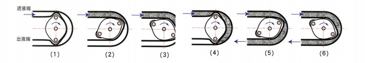 一、概述 FRU系列軟管泵是一種容積式泵,具有轉速低、效率高、無噪音等特點,用途非常廣泛。其工作原理是:一對滾輪在充滿潤滑油的泵腔內轉動,滾輪和泵殼腔壁一起擠壓著軟管,將軟管壓扁。隨著滾輪的轉動,軟管被壓扁的地方也逐漸從泵的進液端向出液端移動。在此過程中,進液滿的軟管在自身彈性作用下逐漸恢復原狀,容積變大,從而產生真空將物料吸入,出液端的軟管逐漸被擠壓,容積變小,從而將物料強行排出,如此周而復始,物料就不斷被吸入和排出(如下圖),該泵的適用溫度為≤80℃。 二、工作原理