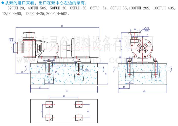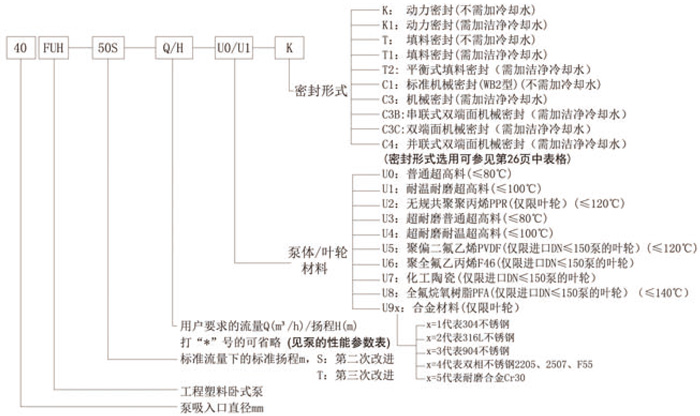 一、概述 FUH系列工程塑料泵是原化工部引進項目和"七五"國家重大科技成果,是在消化吸收引進設備的基礎上,結合國內耐腐蝕離心泵結構的優點精心設計而成,該系列泵1993年列入國家"火炬計劃"項目,獲1995年度新產品獎。 二、用途 FUH系列泵主要應用于各類酸、堿、鹽、油類、食品飲料、酒類等液體。具體應用于化工行業的各種硫酸、鹽酸、堿類、油類等清液或料漿崗位;有色冶煉行業特別是鉛、鋅、金、銀、銅、鈷、鎢、稀土等濕法冶煉中的各種酸液、礦漿、料漿(壓濾機配用)、電解液、污水等介質;化肥行業中稀酸(酸洗工藝用)、母液、氫氟酸、氟硅酸、海水及磷酸料漿等介質;水處理、環保行業中的各類污水(食品污水、電鍍污水、皮革污水、制藥污水、造紙污水、紡織污水、電子污水等)及脫硫除塵;鋼鐵業酸洗系統的硫酸、鹽酸崗位;鈦白粉行業中的酸解、沉降、冷凍、水解、水洗、鹽處理;化纖行業的酸站;檸檬酸的發酵、中和、壓濾、廢水等崗位以及黑色金屬錳業等。此外,該系列泵不僅可以替代以上行業中的國內同類金屬與非金屬產品,也是進口設備國產化的優選產品。 三、型號說明